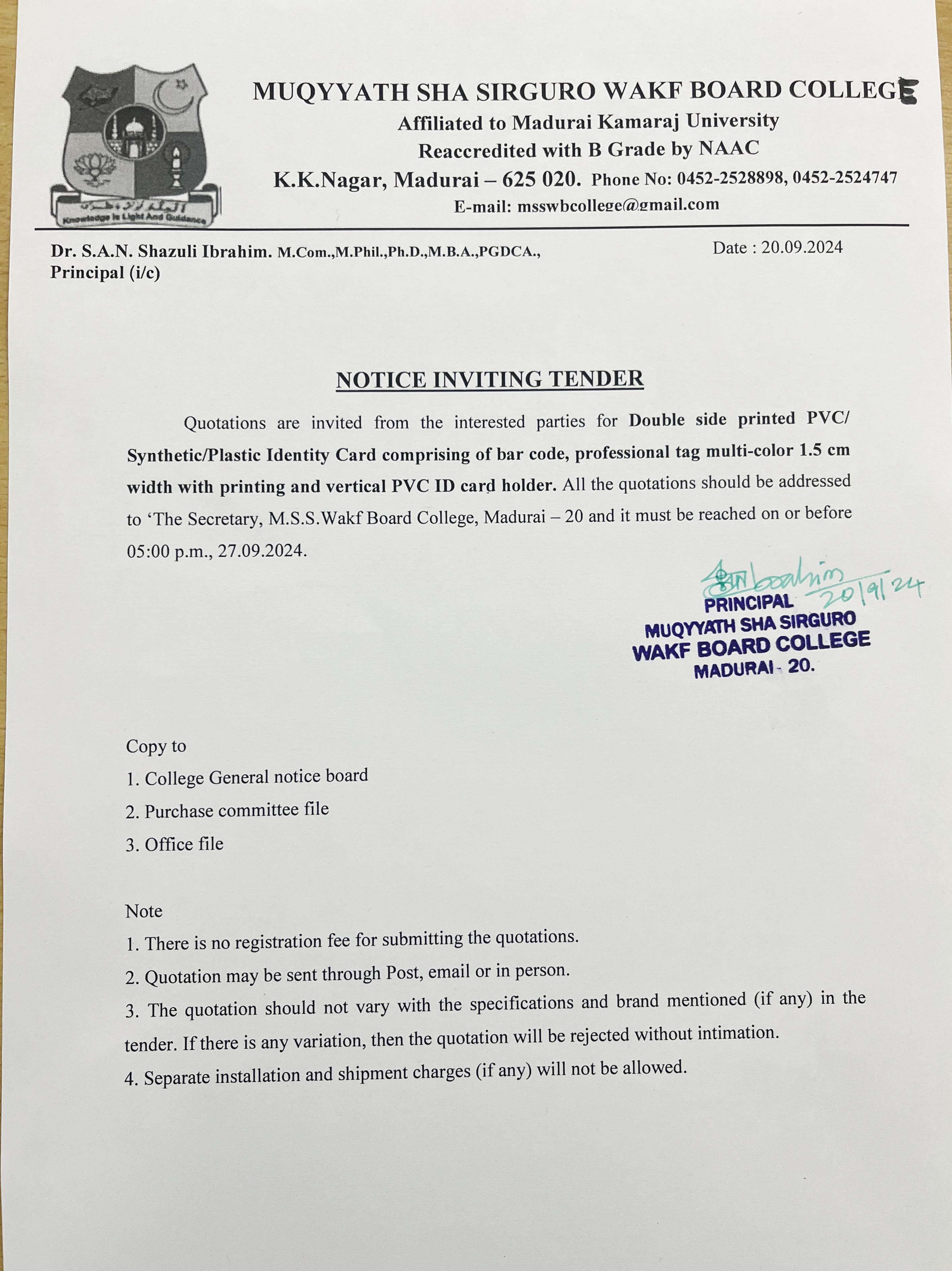 Tender Notice - PVC Identity card with Bar Code